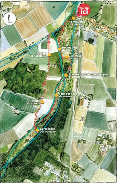 Un sentier de 4,5 km, jalonné de panneaux pédagogiques illustrés, dévoile l’histoire du marais depuis la période glaciaire, la formation de la tourbière et les paysages chers à Rabelais. Pour un confort optimal, près d’1 km de passerelles en bois permet de se promener au sec, franchissant élégamment les ruisseaux qui sillonnent le marais. En 1h30, 2h ou davantage pour les rêveurs, chacun est invité à vivre une balade apaisante, surprenante et gratuite, au cœur de la plus grande roselière d’Indre-et-Loire.